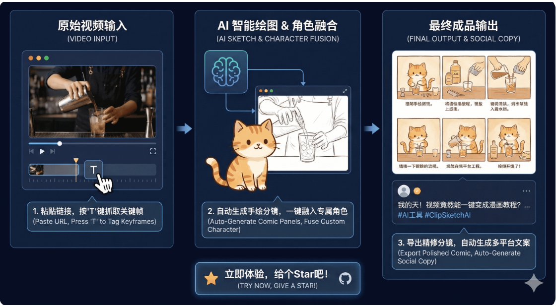 随着内容创作竞争进入白热化阶段,视频不再只是流量入口,更是视觉表达与内容传播的核心。但创作者往往需要耗费大量时间去剪辑视频、截图、设计封面图,还要绞尽脑汁写文案。这其中很多重复性工作其实可以被 AI 自动化解决——这正是 ClipSketch AI 项目的价值所在。