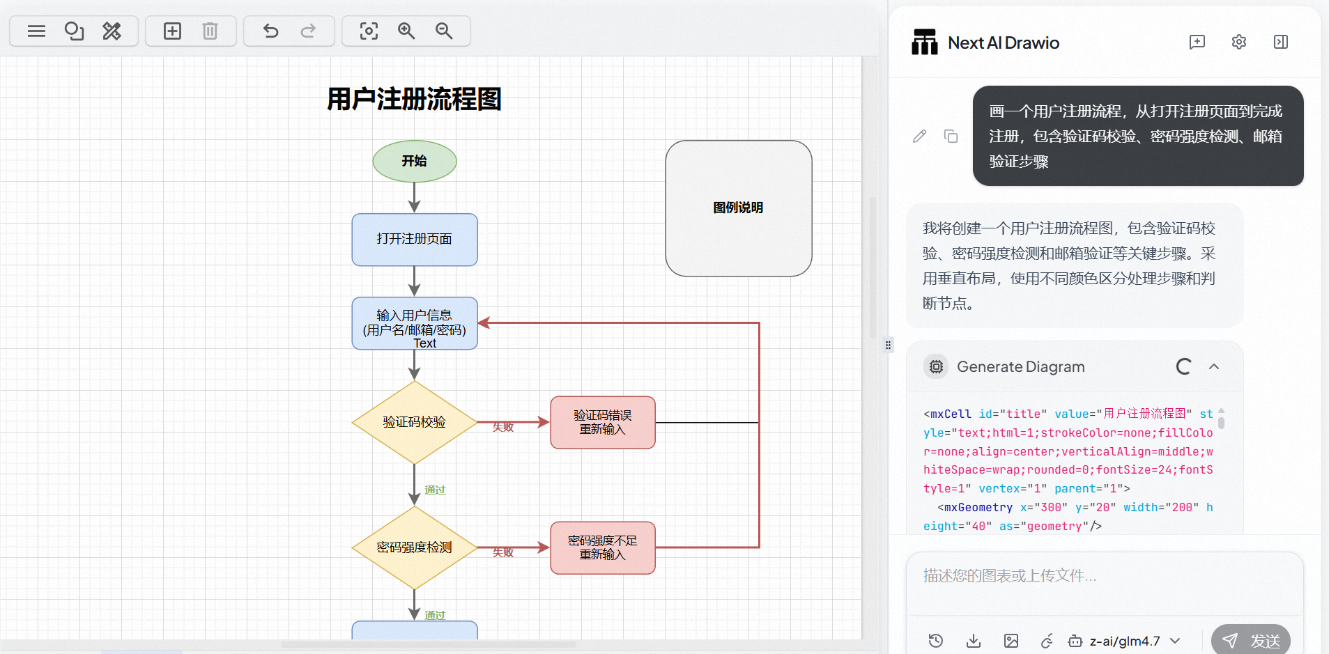 "画一个用户注册流程,从打开注册页面到完成注册,包含验证码校验、密码强度检测、邮箱验证步骤"5秒钟,流程图出来了。步骤清晰,连线规范,连异常处理路径都自动画出来了。